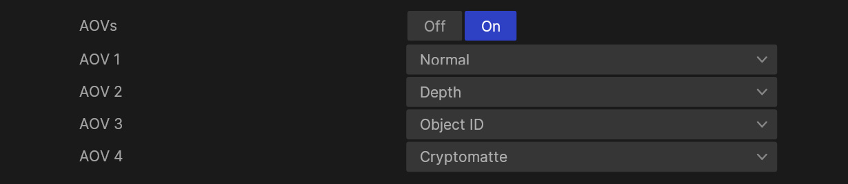 AOVs (arbitrary output variables) are additional render outputs that can be rendered in tandem with the main pass. You can select one or more different AOVs to output by selecting them in the AOV dropdown properties.