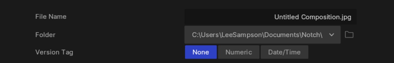 Notch supports a number of Filename Macros to automate the naming of your files based on properties such as the date, the composition name or the camera name, as well as many more.