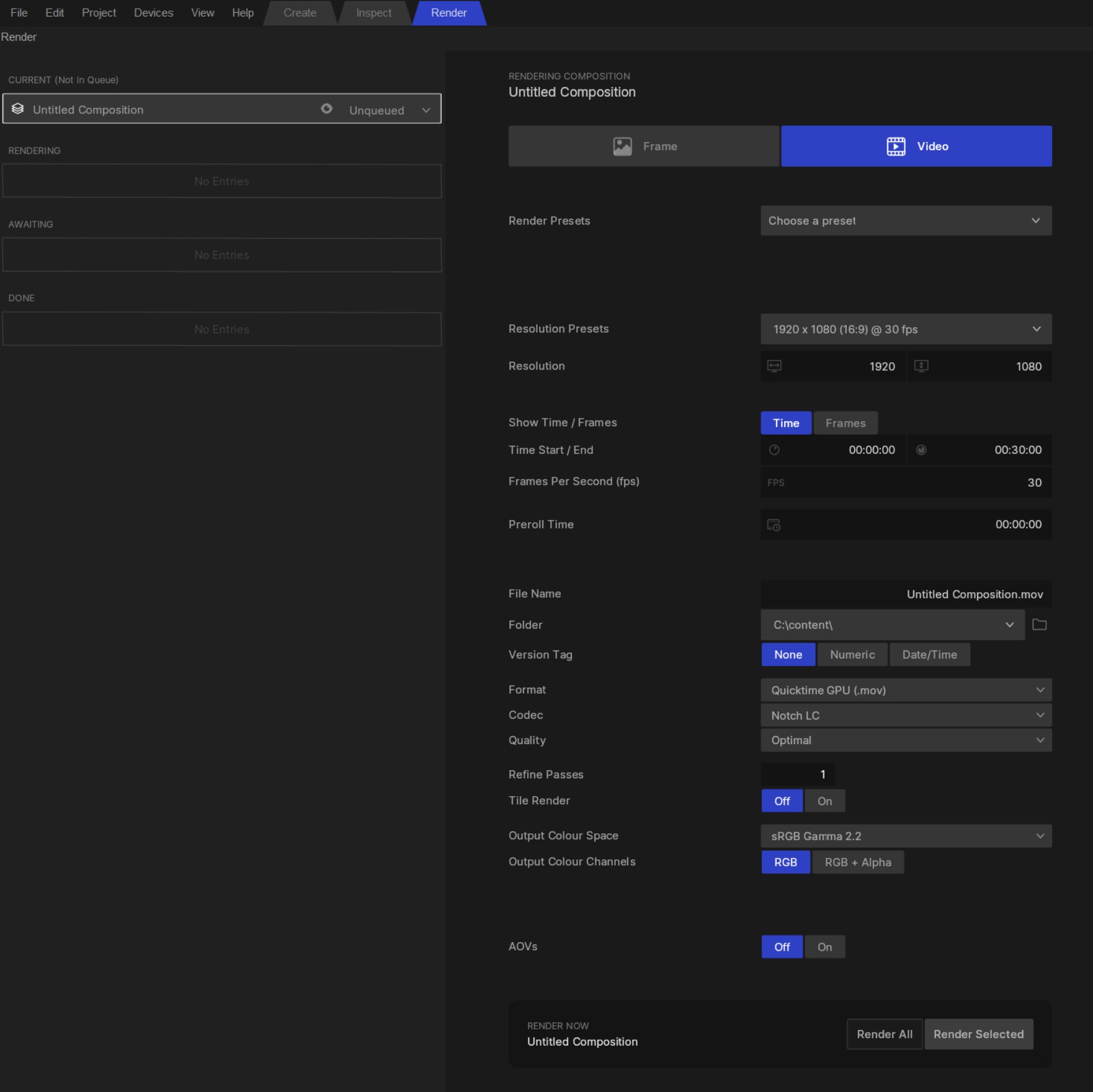 To render a composition to a file, first select the composition you want to render in the main Nodegraph view. Now when you open the Render Window by clicking the “Render” tab at the top left of the screen, you will see that your composition has been added to the “Current (Not In Queue)” slot. This means that is is ready to be rendered, but is not in the Render Queue (which deals with sequences of renders).