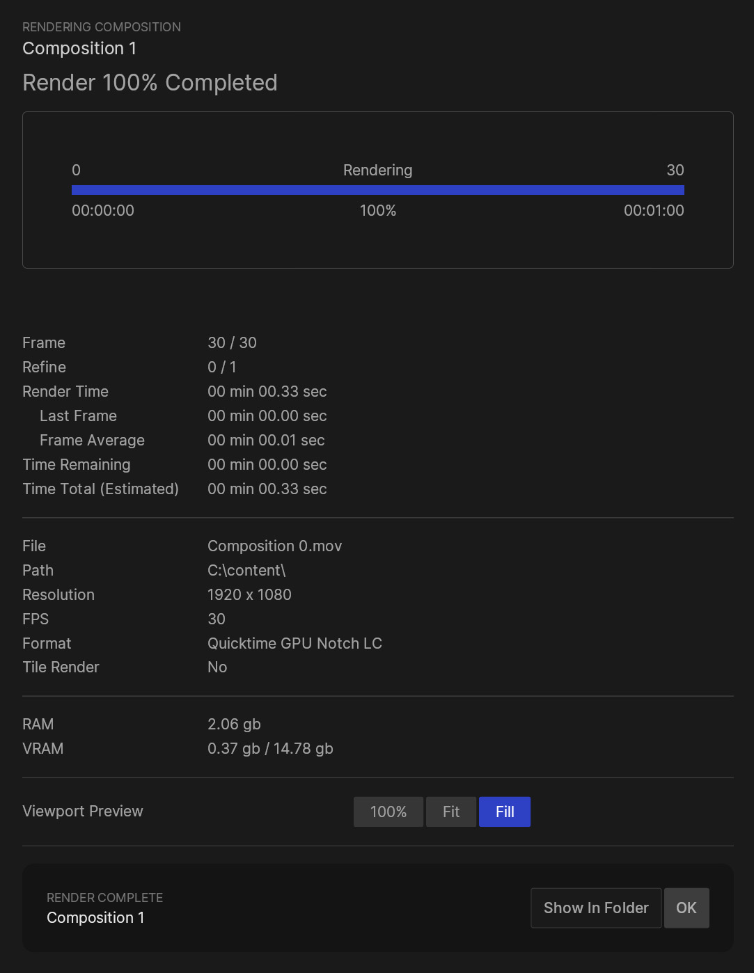 Once the render is done, you can click the “Show In Folder” button to open the location of the rendered file.