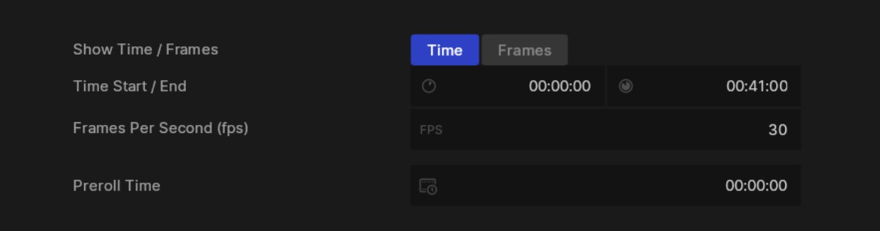 You can set this either in number of frames, or in time (MM:SS:FF). To change this simply select the corresponding option from the “Show Time / Frames” property.