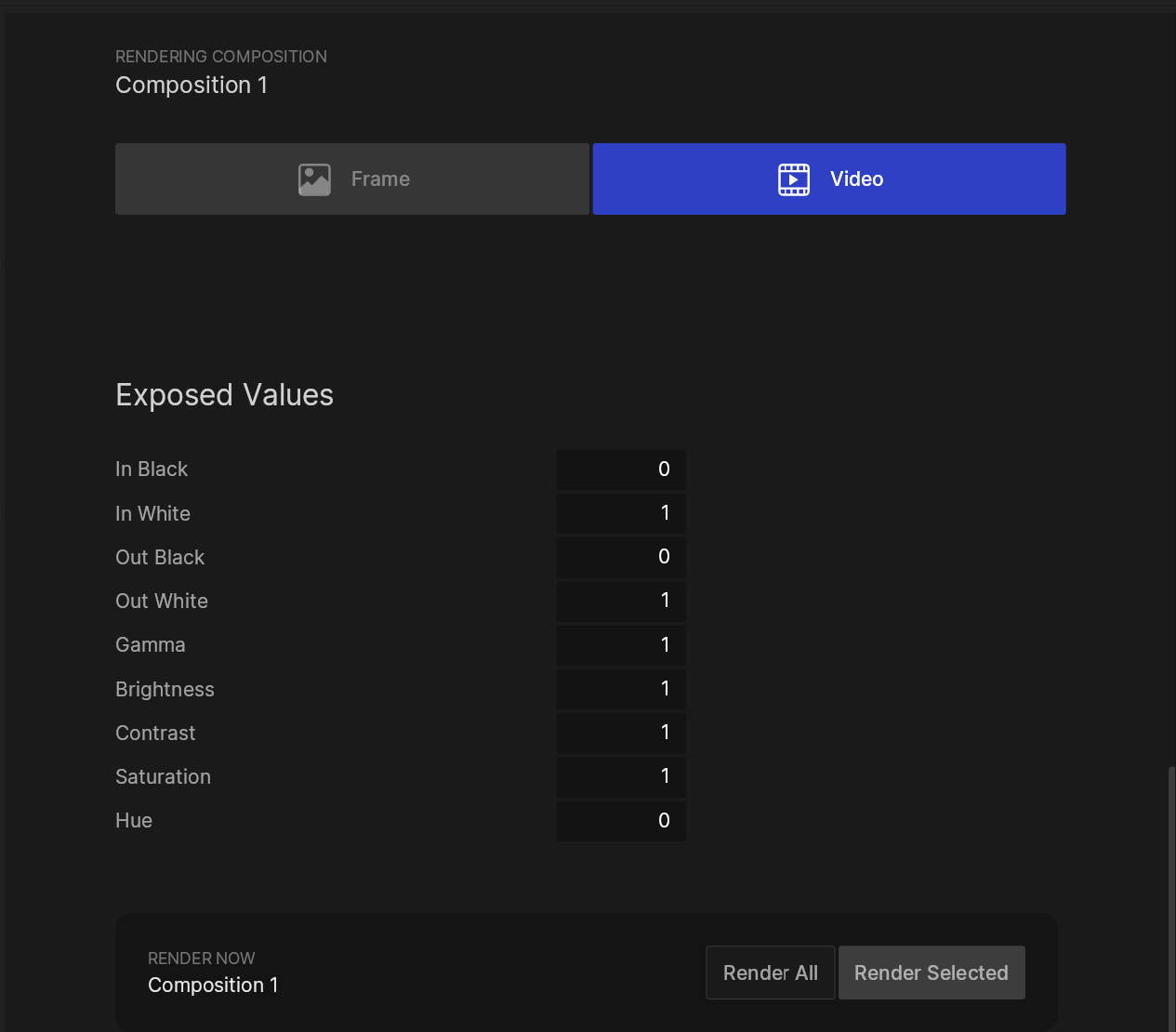 In addition to the standard render settings that are included by default in each item in the Render Queue, you can also expose Render Parameters from your compositions and make them available and editable in each render job. This allows you to have multiple render items in the queue which have the same source composition, but can be used to output variations based on how the Exposed Render Parameters are set.