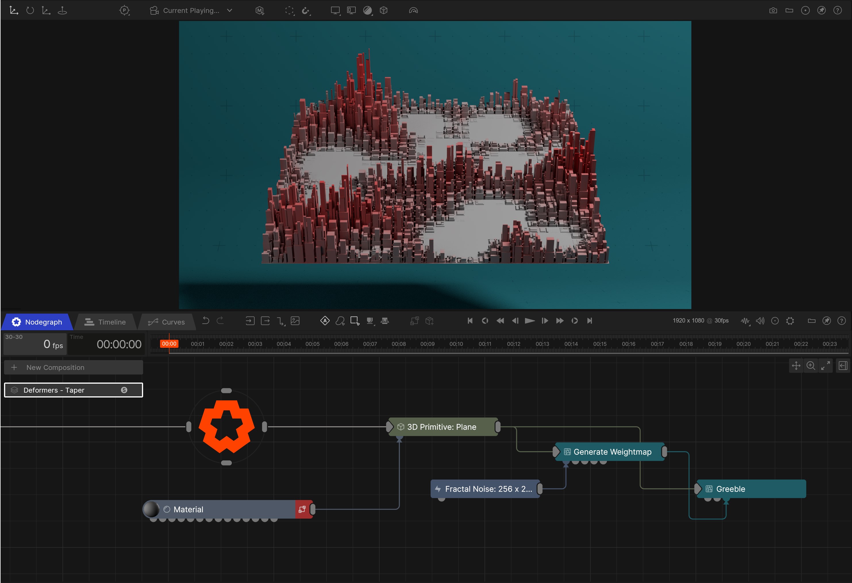 Deformers are the main geometry modification tools in Builder. Any node which generates a Mesh, Spline, Line or Point, can have Deformers applied to them and the affects generated.