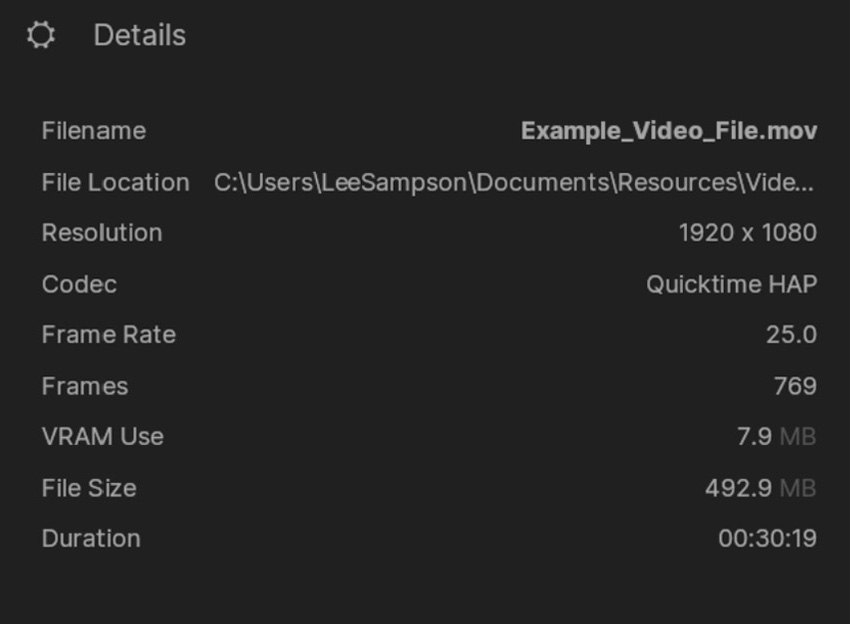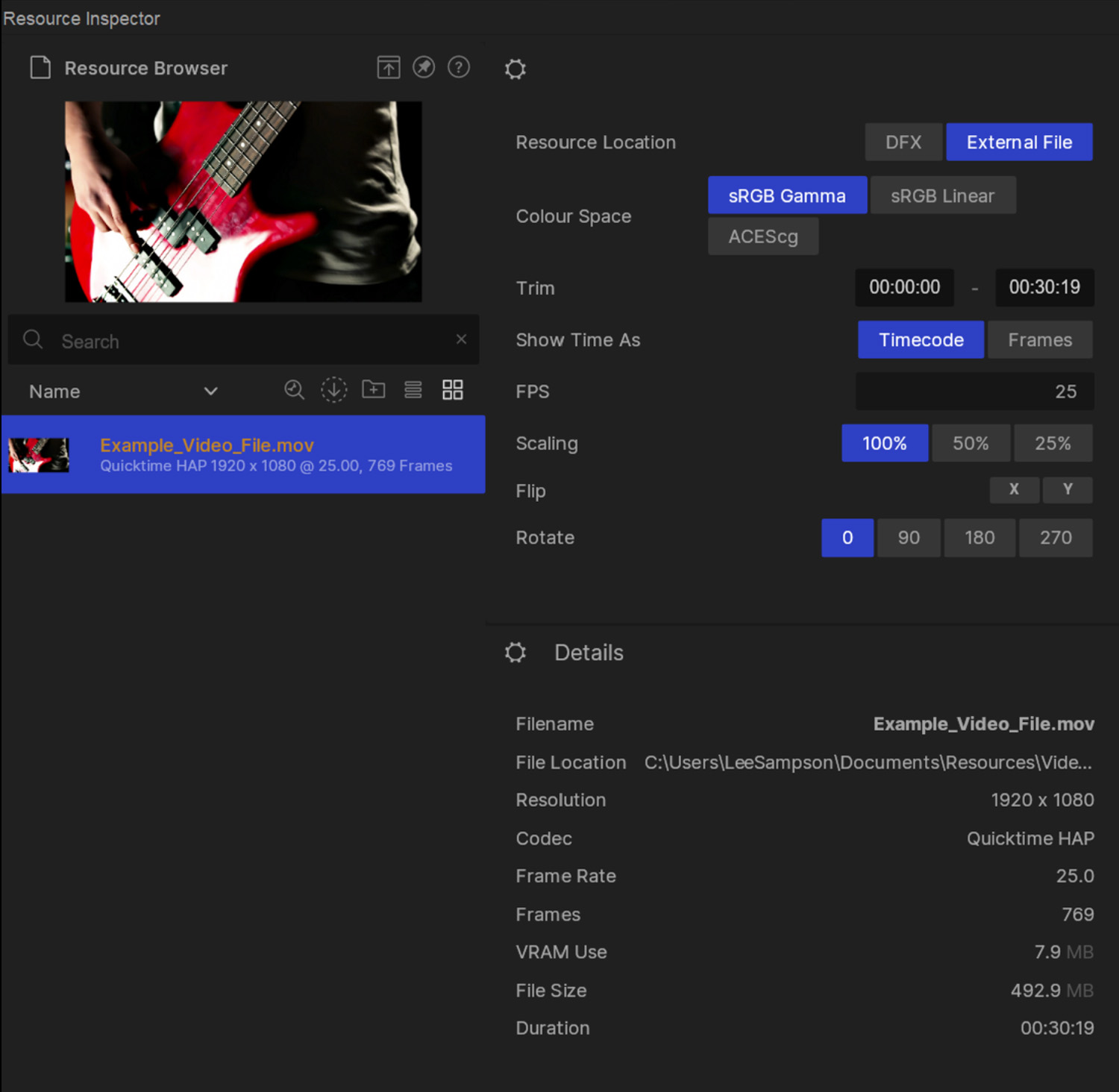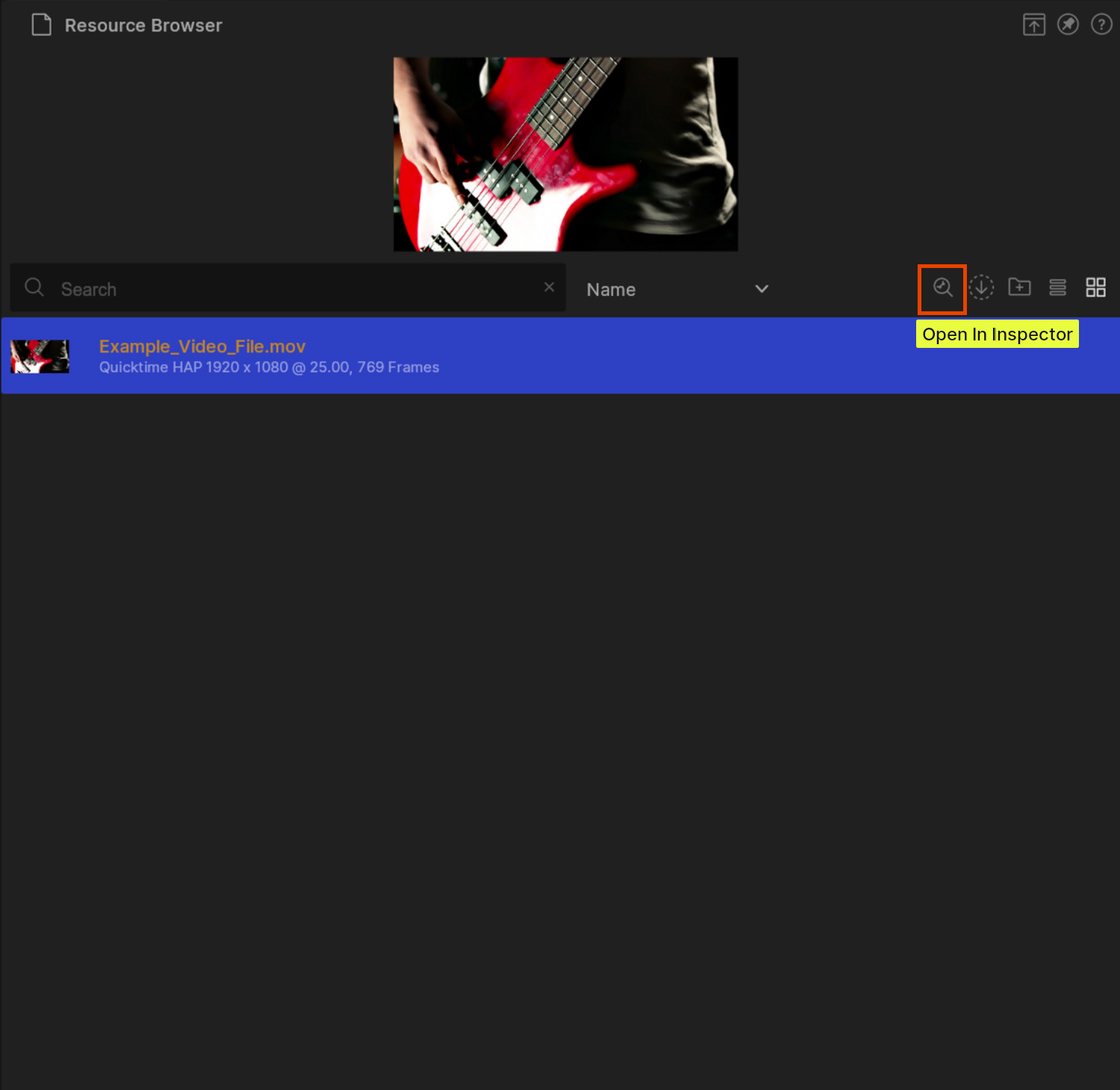 Inspecting the details of video and image files in Notch is achieved by using the Inspector. Here you can view file specific meta data as well as make some basic adjustments to the file.
