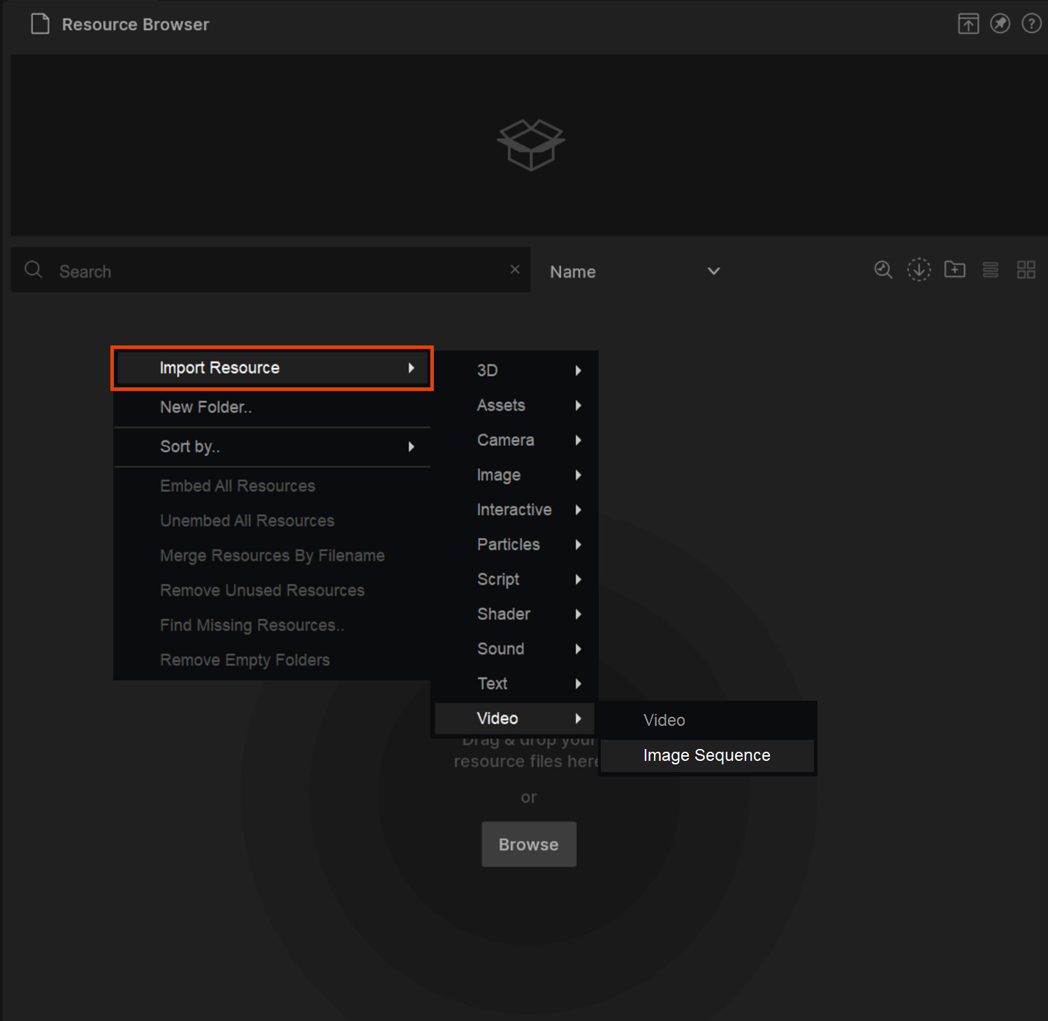 Importing video and image files in Notch is achieved by using the Resource Browser.