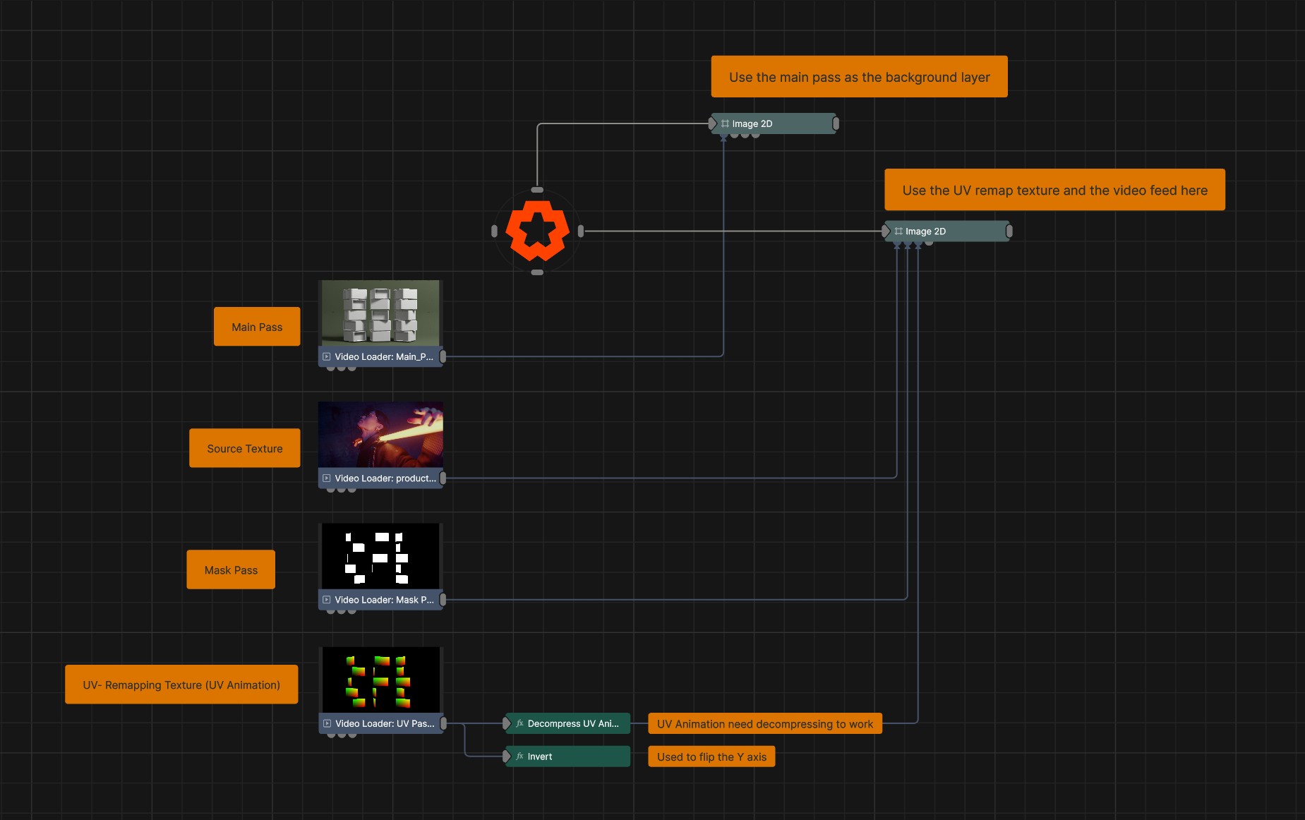 UV remapping textures that are transcoded to UV Animation will need to be decompressed using the Decompress UV Animation node.