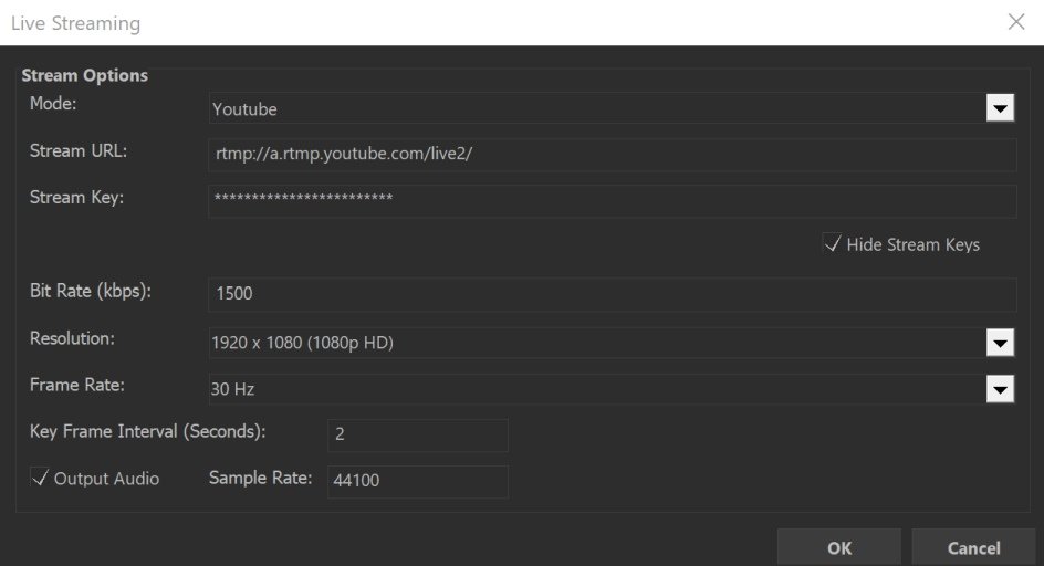 | Output Audio | This allows you to choose whether to send an audio channel to the streaming service. Most streaming services (like YouTube, Vimeo etc) require you to send an audio channel, even if there is no actual audio coming down the channel, so it’s best to keep this on. |