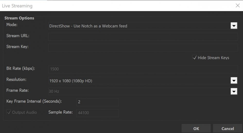Unlike RTMP/RTMPS streaming, DirectShow/NotchCam devices do not carry audio. Instead, you’ll need to select an audio source in your third party software.