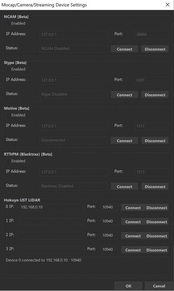 192.168.0.xxx (where xxx is 1-255 and is not 10).255.255.255.0In Notch go to Devices->Mo-cap/Camera/Streaming Device Settings. At the bottom of the window is the Hokuyo settings, put the LiDAR IP address (192.168.0.10) and the port number is 10940. Press connect, You will see at the bottom of the window that the device is now connected.
