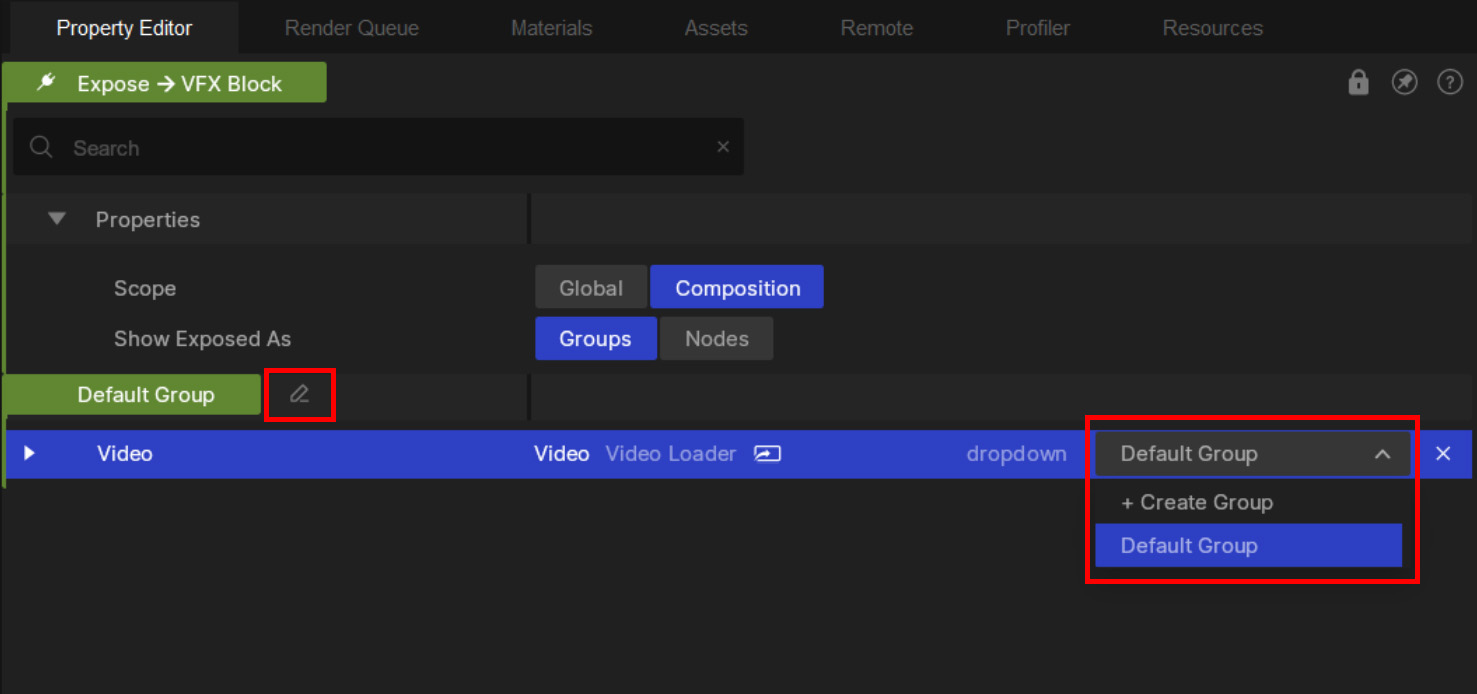To make a new group, click on the “group dropdown” in the Exposed VFX Node’s property editor menu.